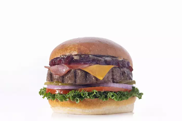 בורגר 220 גרם , חזה אווז , ריבת בצל , גבינת צ'דר , חסה , עגבניה , חמוצים , בצל סגול כולל ציפס